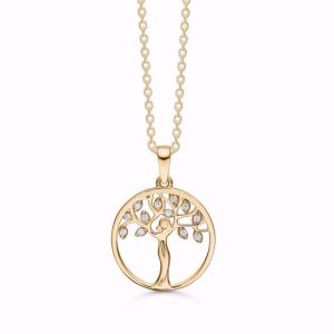 Guld vedhæng livets træ med zirkonia 8kt. Med 45cm forgyldt sølv kæde